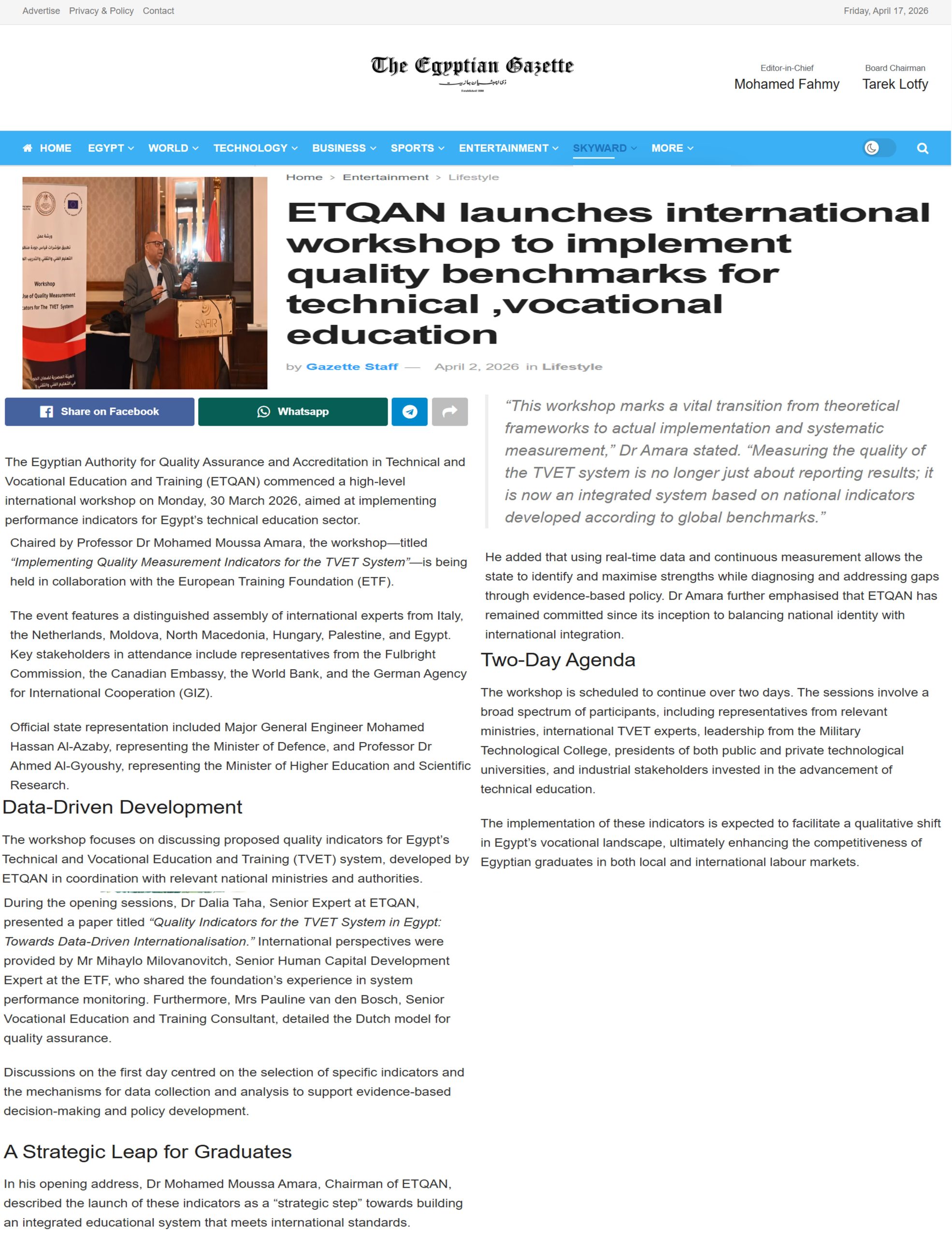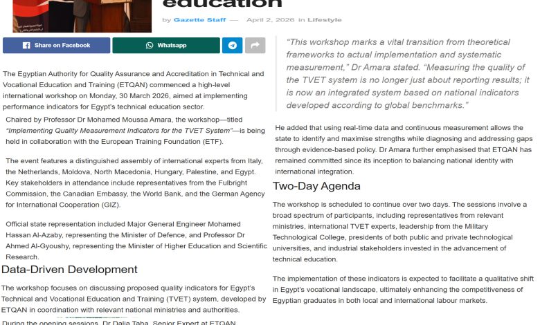 The Egyptian TVET for Quality Assurance and Accreditation (ETQAAN) commenced a high-level international workshop on Monday, 30 March 2026, aimed at implementing performance indicators for Egypt’s technical education sector.
