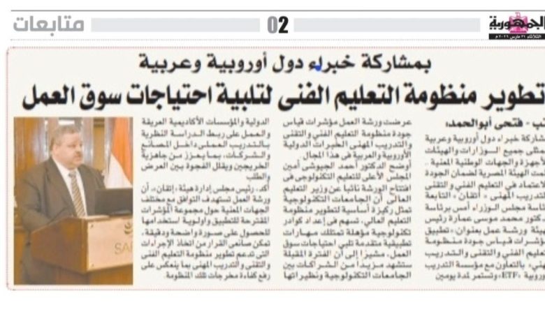 Al Gomhuria Newspaper covers the workshop: “The Use of Quality Measurement Indicators for the TVET System” Issue of Tuesday, March 31, 2026