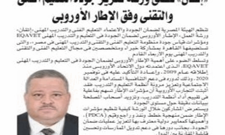 With the participation of international experts from the European Training Foundation (ETF), ETQAAN Authority will hold a workshop tomorrow, Wednesday, 3 December 2025, entitled: “The European Quality Assurance Framework for Vocational Education and Training (EQAVET)” ith the participation of international experts from the European Training Foundation (ETF), ETQAAN Authority will hold a workshop tomorrow, Wednesday, 3 December 2025, entitled:…